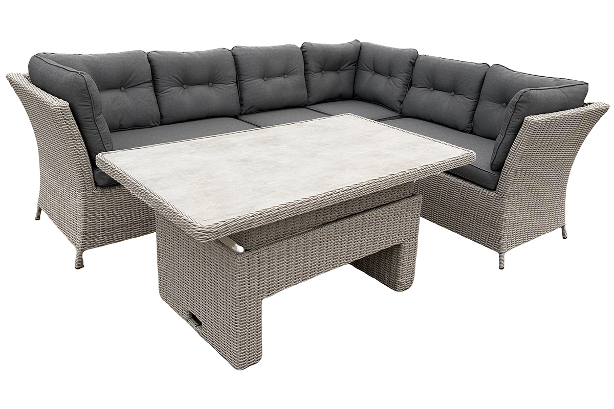 Det medfølgende bordet har hev- og senkefunksjon (52–68 cm), slik at du enkelt kan justere høyden fra lounge- til spisebord. Bordplaten i keramisk herdet glassplate gir et moderne preg og er både robust og lett å rengjøre.