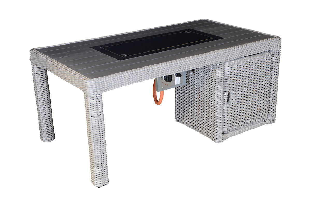 Calla Vanda peisbord er et nydelig hagebord med innsettbar gassbrenner. Sofabordet leveres med grå rotting og polywood bordtopp med matchende farge. Med praktisk skap for oppbevaring av gassflasken (5kg flaske)er dette bordet godt egnet for hygge på lange sommerdager. Gasspeisen har eget lokk som enkelt benyttes hvis behov for bruk av hele bordflaten.