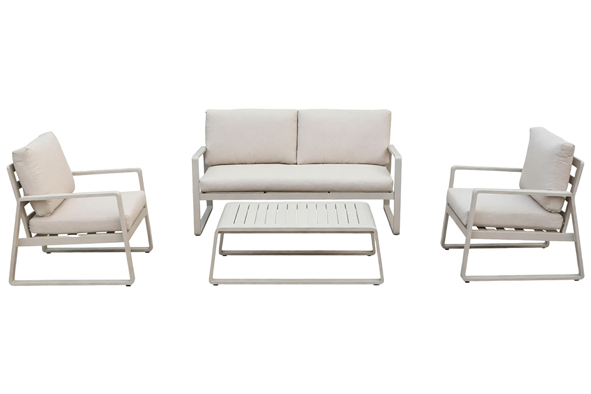 Skap en stilren og komfortabel uteplass med Calluna sofasett – en elegant hagegruppe i beige aluminium. Settet består av to lenestoler, en 2-seters sofa og et sofabord med aluminiumsbordplate – perfekt for både avslapning og hyggelige sammenkomster på terrassen, i hagen eller på balkongen.