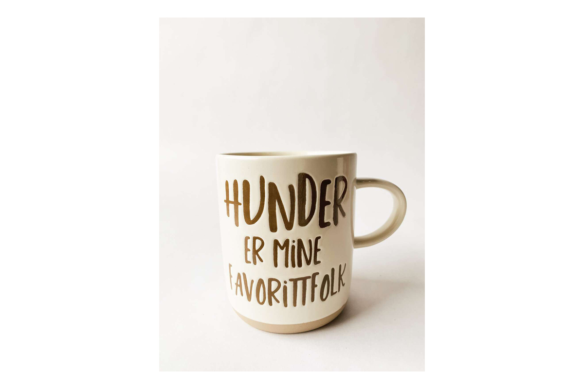 Et flott krus med tekst på en side og gjennomført look med dekorkant i bunn.
