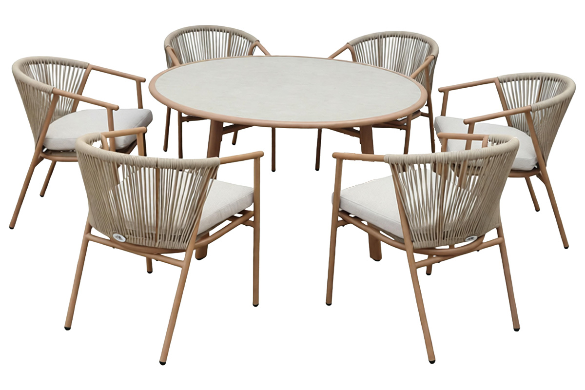 Melia spisegruppe er en elegant og moderne hagegruppe til uteplassen bestående av 6 komfortable stoler og et rundt bord med glassplate. Hagesettet er perfekt for hyggelige måltider på terrassen eller i hagen.