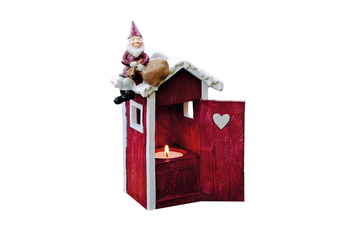 Nisse, kledd i rød lue og jakke og hvit bukse, sitter på taket av en rød og hvit utedo. Pass på hvor du setter deg – det kan være varmt!