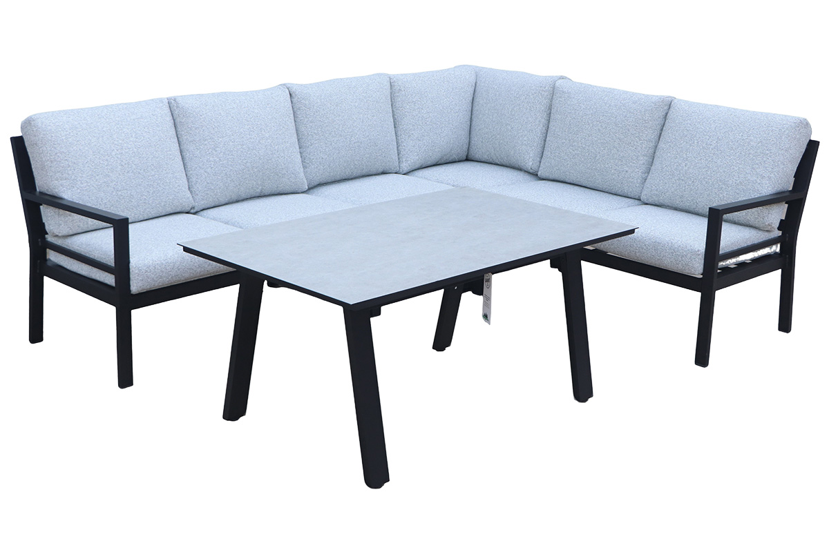 Nova Anemone hagegruppe er en moderne og stilren hjørnesofa med høyt bord – perfekt for deg som ønsker både avslapping og muligheten til å spise ved samme møbelgruppe. Den smarte bordhøyden gjør at du enkelt kan dekke på til middag, samtidig som hagegruppen fungerer utmerket til avslappende sofakvelder med familien.