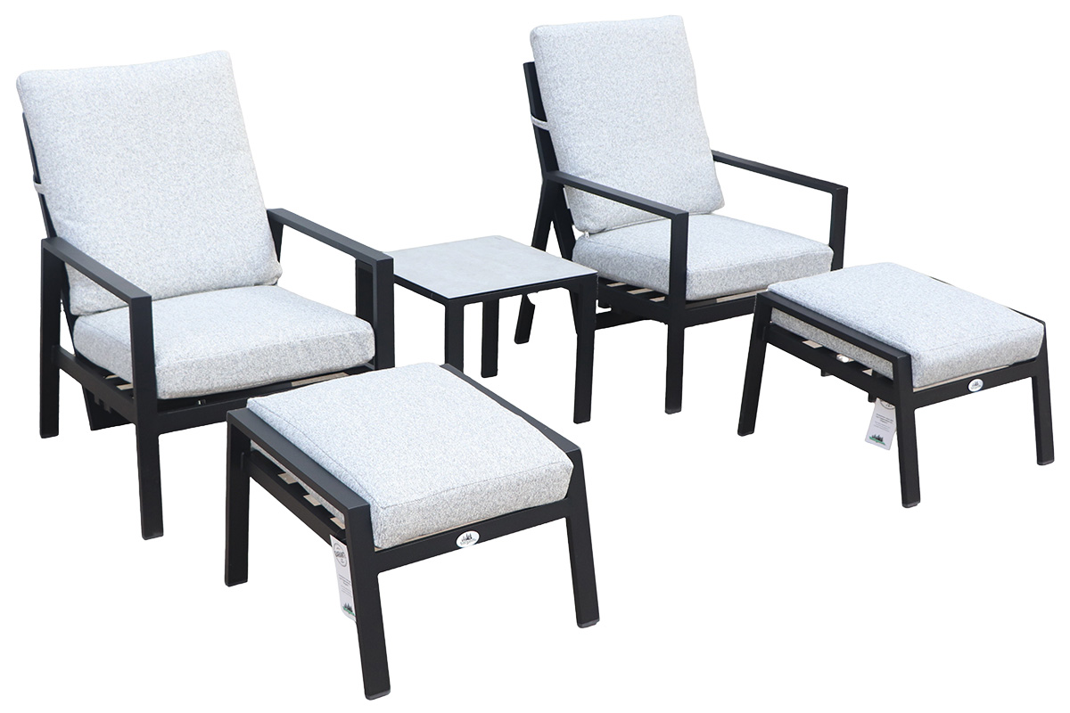 Reclinerstolene har regulerbar rygg som enkelt tilpasses ønsket sittestilling – fra oppreist til mer avslappet. Sammen med de medfølgende fotskamlene gir dette optimal komfort for lange, avslappende dager utendørs.