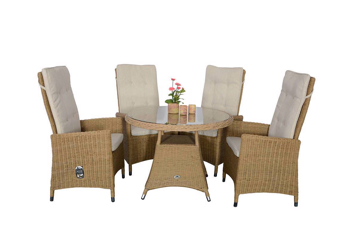 Stolene har høy rygg og trinnløs regulering, slik at du enkelt kan tilpasse sittestillingen etter behov. Enten du sitter samlet rundt middagsbordet eller lener deg tilbake med en kopp kaffe, får du optimal støtte og komfort. Møblene er håndlaget i kunstrotting i en elegant brun naturfarge, kombinert med beige puter som gir et moderne og helhetlig uttrykk. Den solide aluminiumsrammen sørger for stabilitet og lang levetid, samtidig som materialene er godt egnet for utendørs bruk.