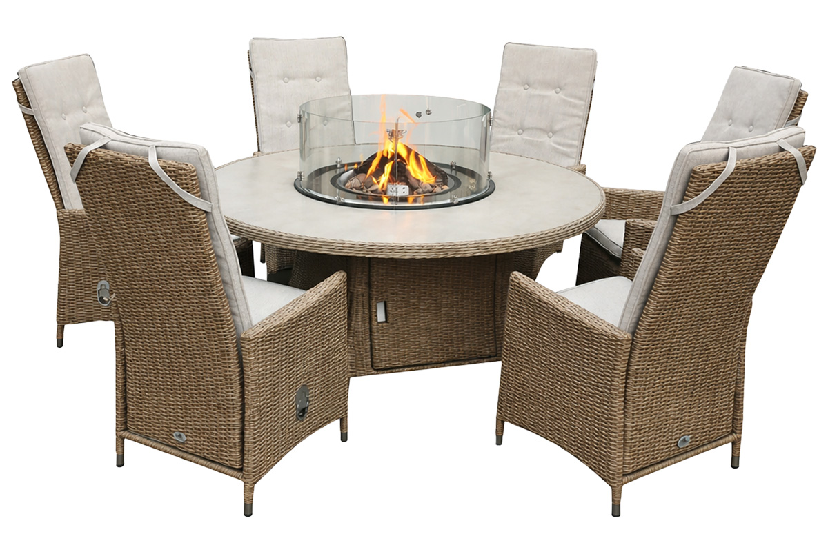 Olea spisegruppe med regulerbare stoler, rundt bord og gassbrenner.