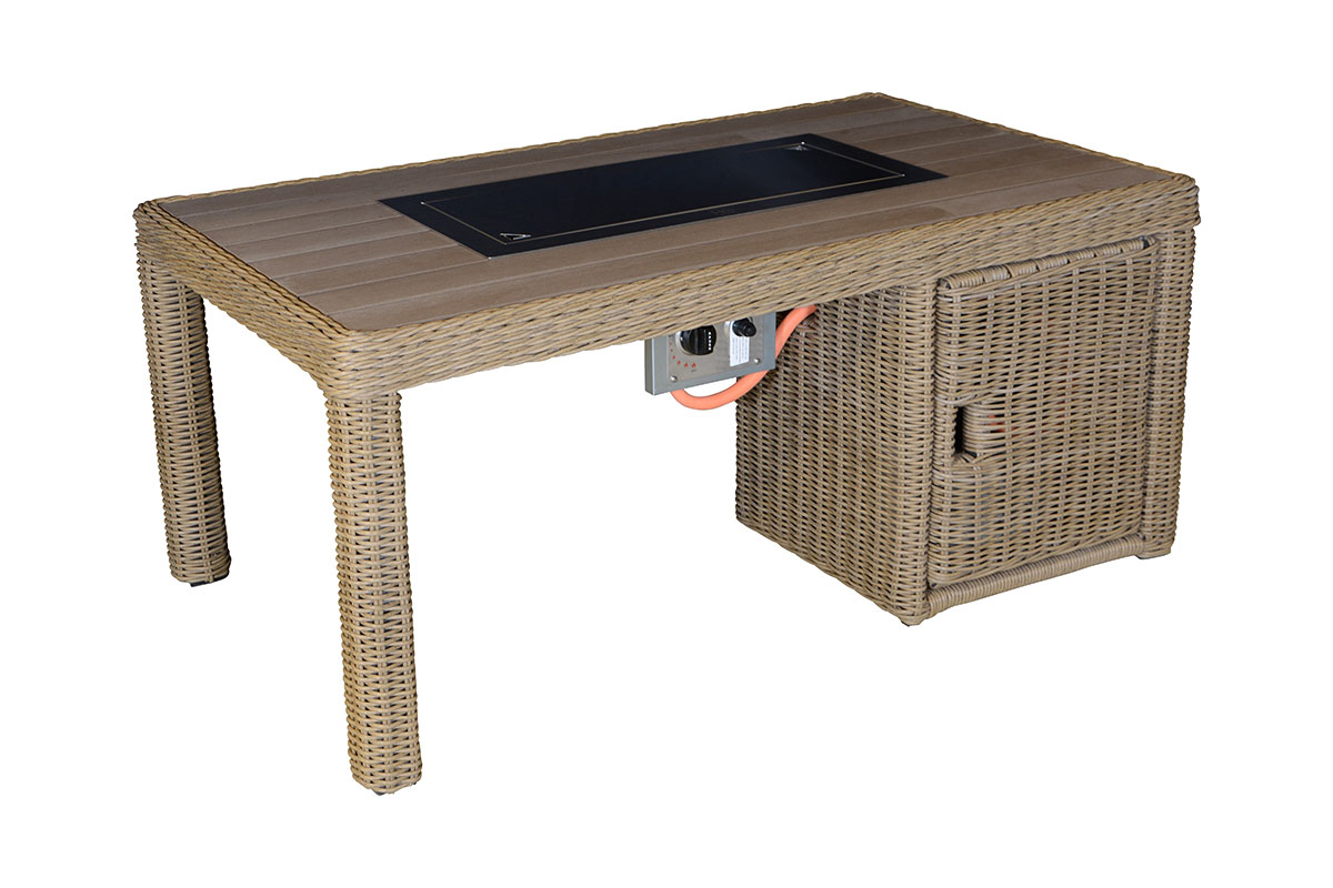Ornata Vanda peisbord er et nydelig hagebord med innsettbar gassbrenner. Sofabordet leveres med naturfarget rotting og polywood bordtopp med matchende farge. Med praktisk skap for oppbevaring av gassflasken (5kg flaske)er dette bordet godt egnet for hygge på lange sommerdager. Gasspeisen har eget lokk som enkelt benyttes hvis behov for bruk av hele bordflaten.