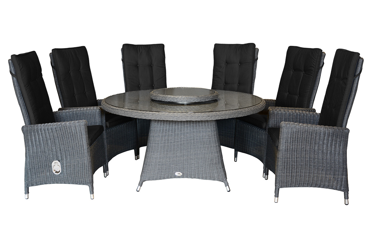 Valida er en komfortabel og elegant spisegruppe som kombinerer funksjonalitet med tidløst design. Gruppen består av seks stoler med høy rygg og justerbar rygg, samt et rundt bord med glassplate med keramikkprint – perfekt for både hyggelige middager og avslappende stunder i sommervarmen.