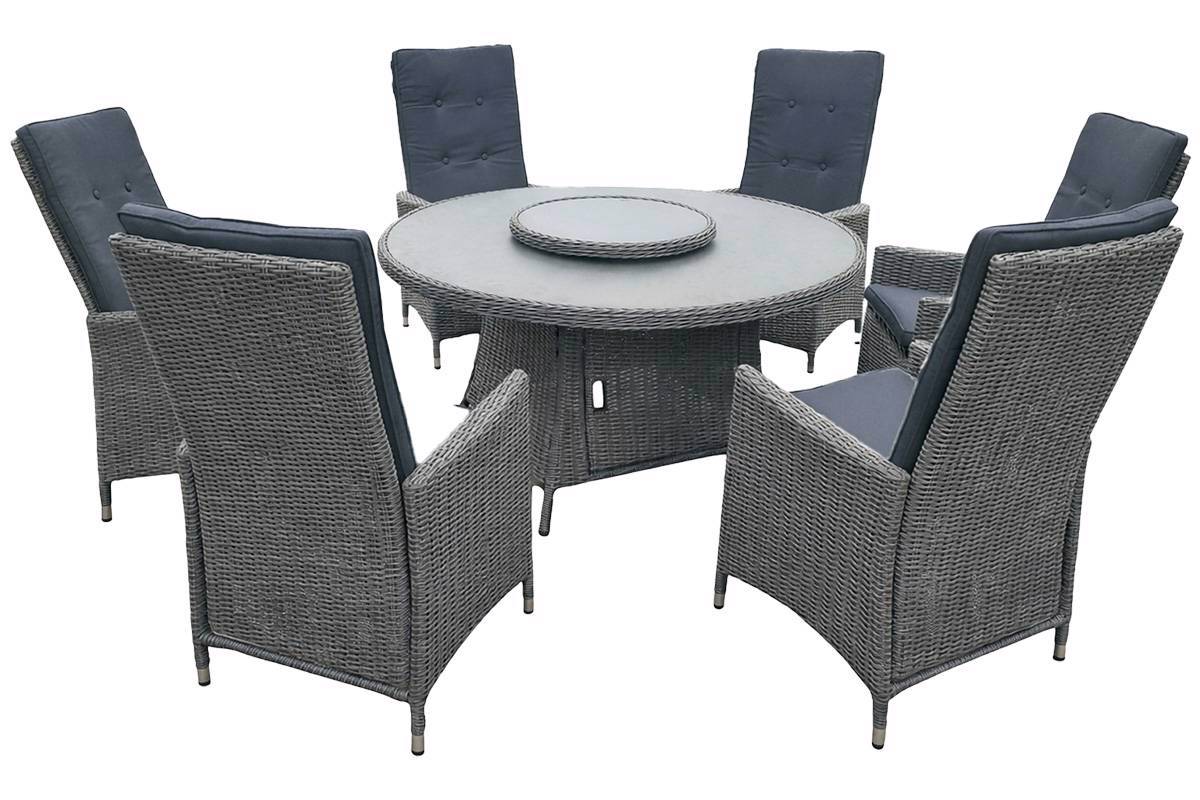 Det runde hagebordet har en elegant glassplate med keramikkprint som gir et stilrent og helhetlig uttrykk. I midten av bordet sitter en praktisk dreieskive som gjør det enkelt å sende mat og tilbehør rundt bordet. Dreieskiven kan enkelt tas av og under denne er det mulighet for å sett inn innsettbar gassbrenner (selges separat).