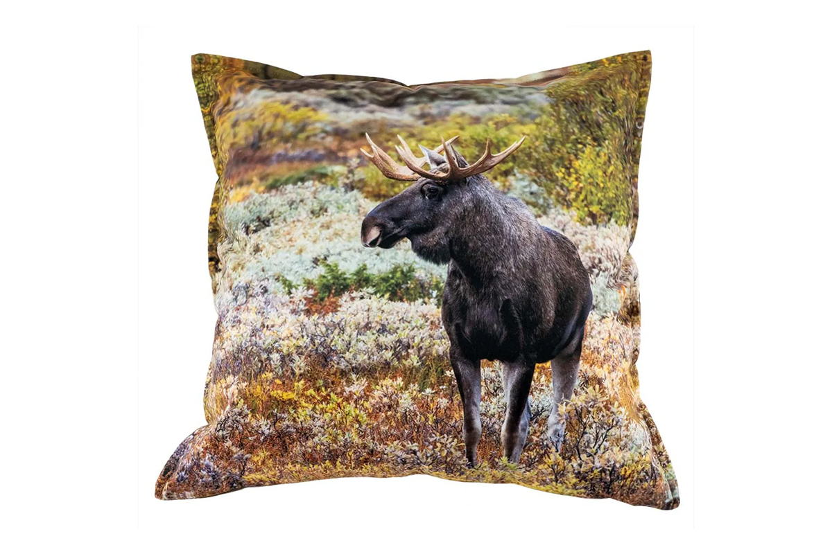 Pute med nydelig bilde av elg i lyngen fotografert av Even Agerup.
